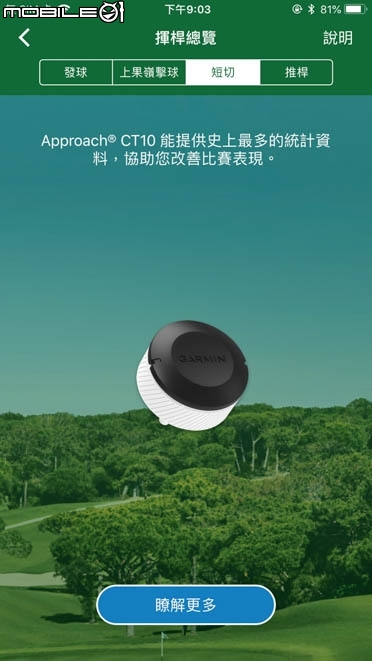 攻上果嶺前,要記得每次揮桿完在腕錶上選擇所使用的桿子,不然回去觀看 app 揮桿記錄的距離數據上可能會誤判,腕錶所記錄的擊球數據在結束球局後可上傳至Garmin Golf App,以利於進行賽後分析。如果需要更精確的感測如切桿和推桿的統計資料,可選購 Approach CT10 揮桿感測器配對,更有助於你了解球桿的詳細擊球距離與數據。