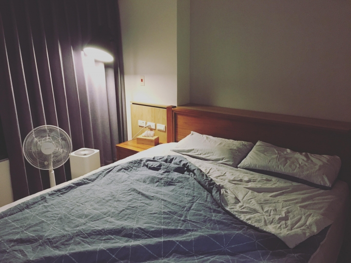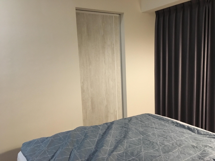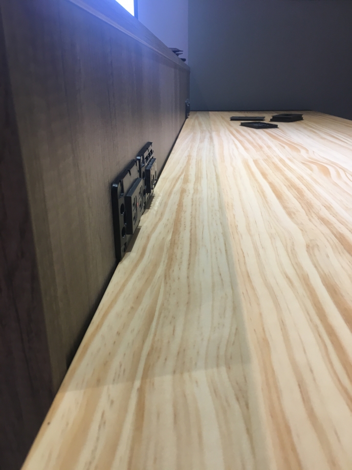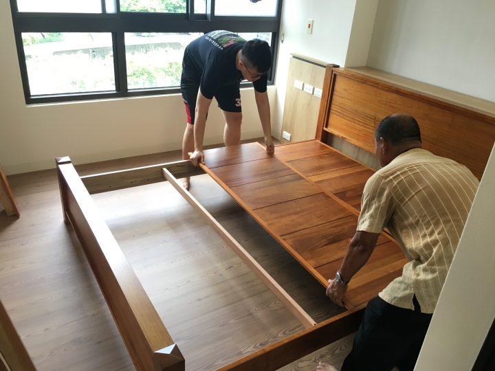 下班後看床頭系統櫃的門板是側掀式,會被我們床架的床頭板擋住,