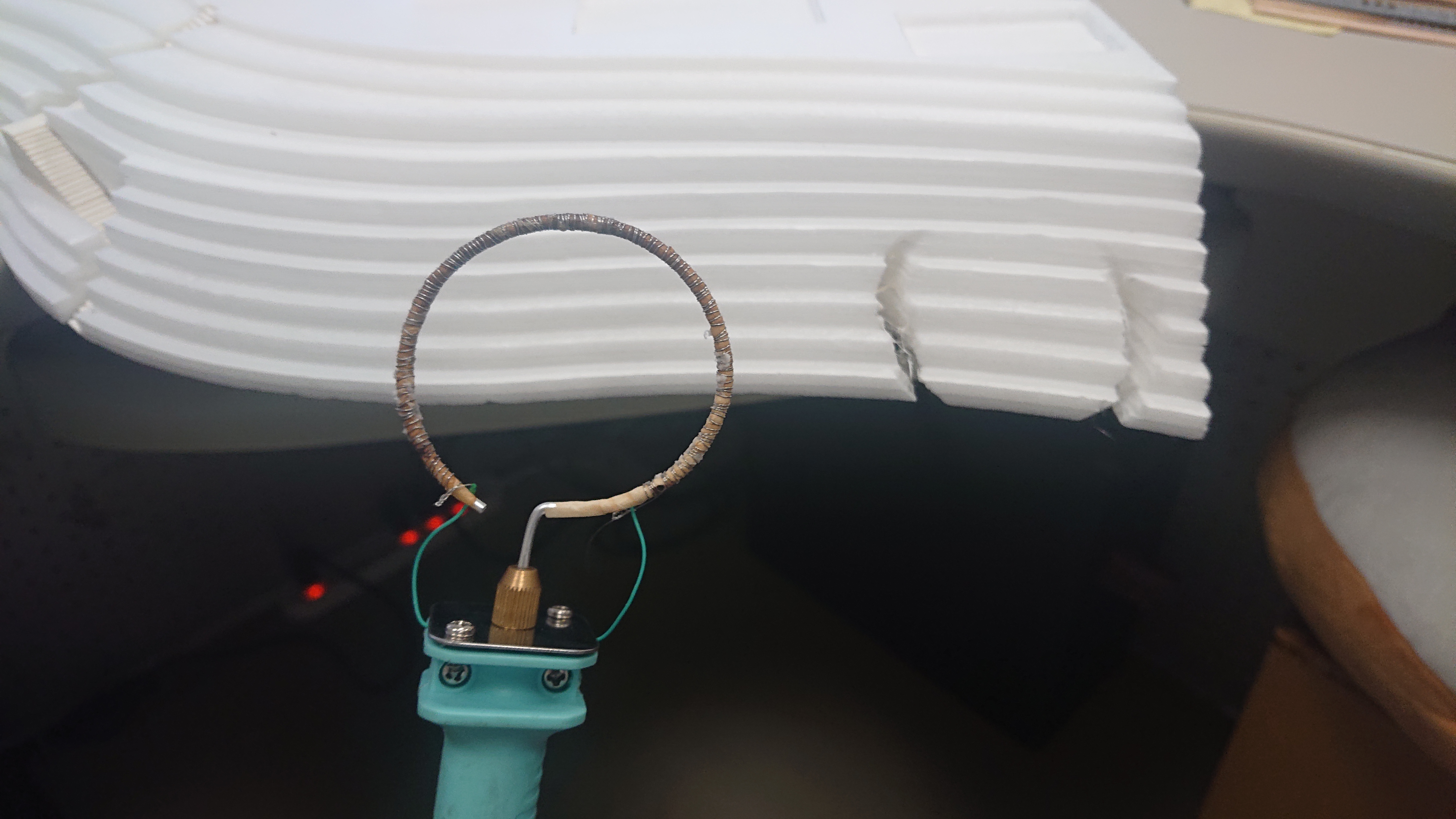 後來研究了一陣子,我想到用鋁線凹出我要的圓形,然後再鋁線的外面纏繞鎳鎘絲(發熱絲),於是自製的保麗龍切割器就誕生了!