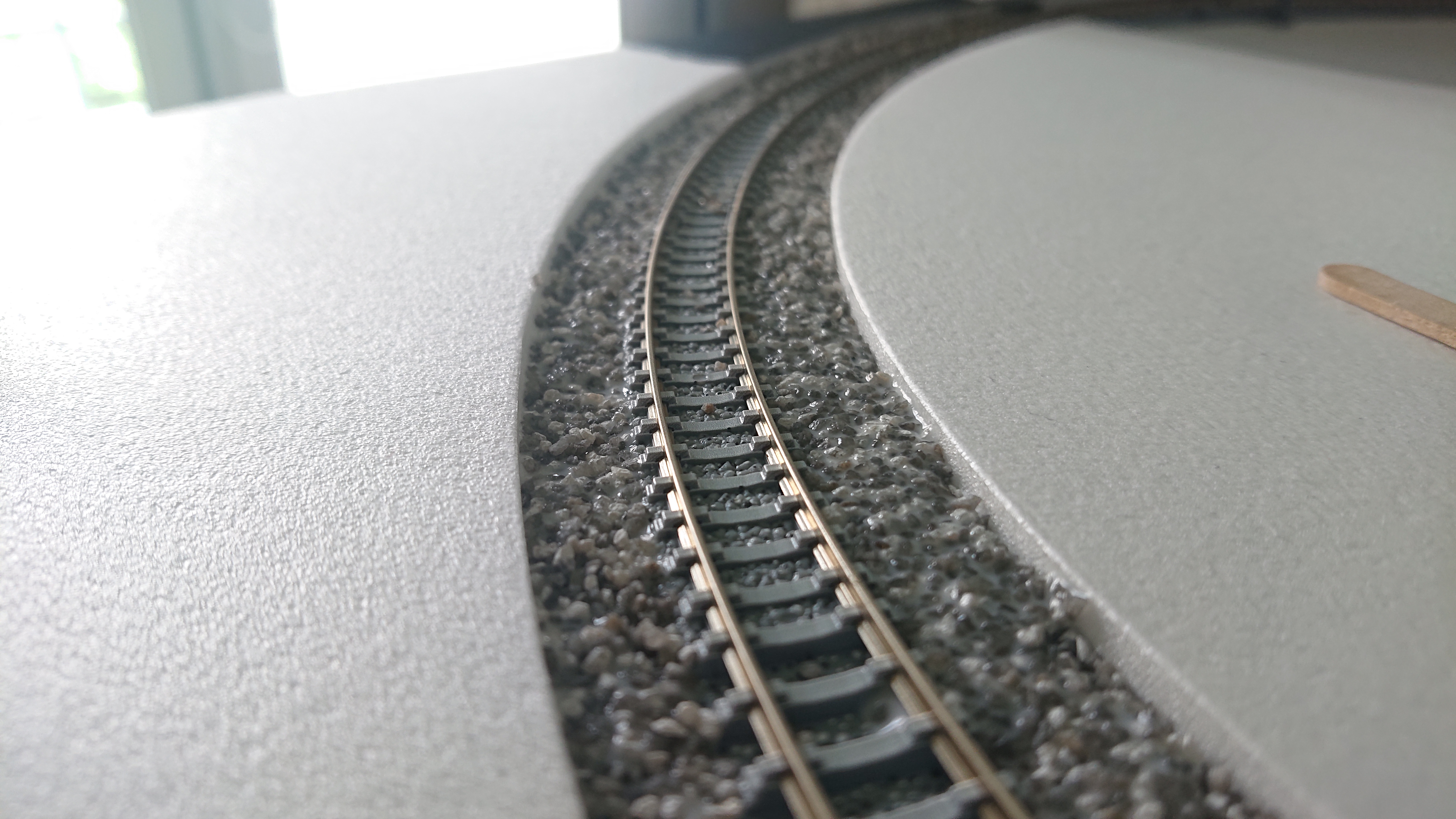 網路上有的作法是,軌道擺好,然後看要舖多厚將碎石鋪上去,然後直接用一次白膠水去固定,但我會分三層鋪設,主要是考量到以後在收納時,有可能會是站立起來,所以才想說把道渣弄牢固一點。