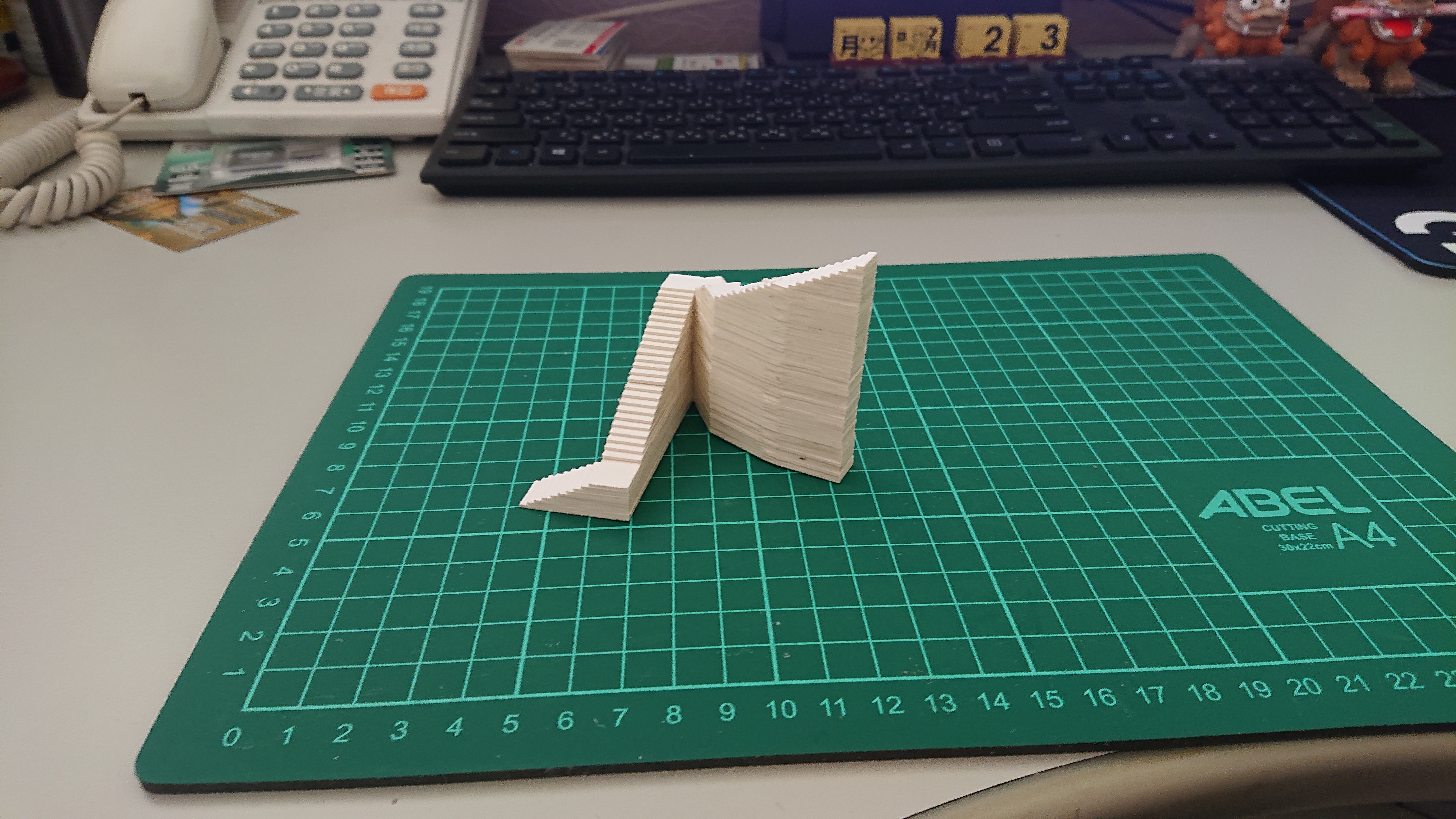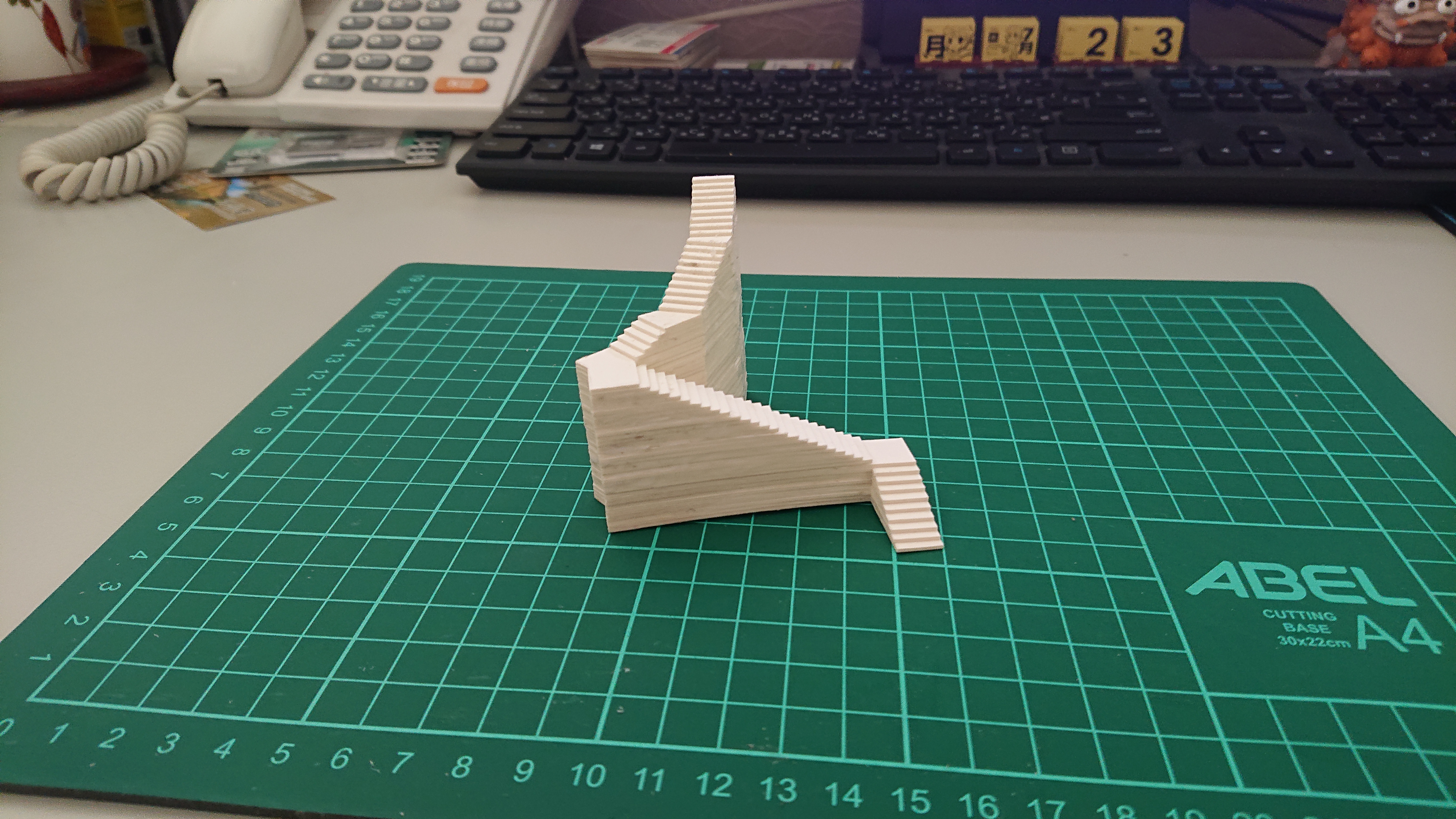 樓梯也是依樣畫葫蘆,將線條輪廓列印出來,然後貼在1mm厚的紙板上,照著線條切割,在一層層的疊起來。