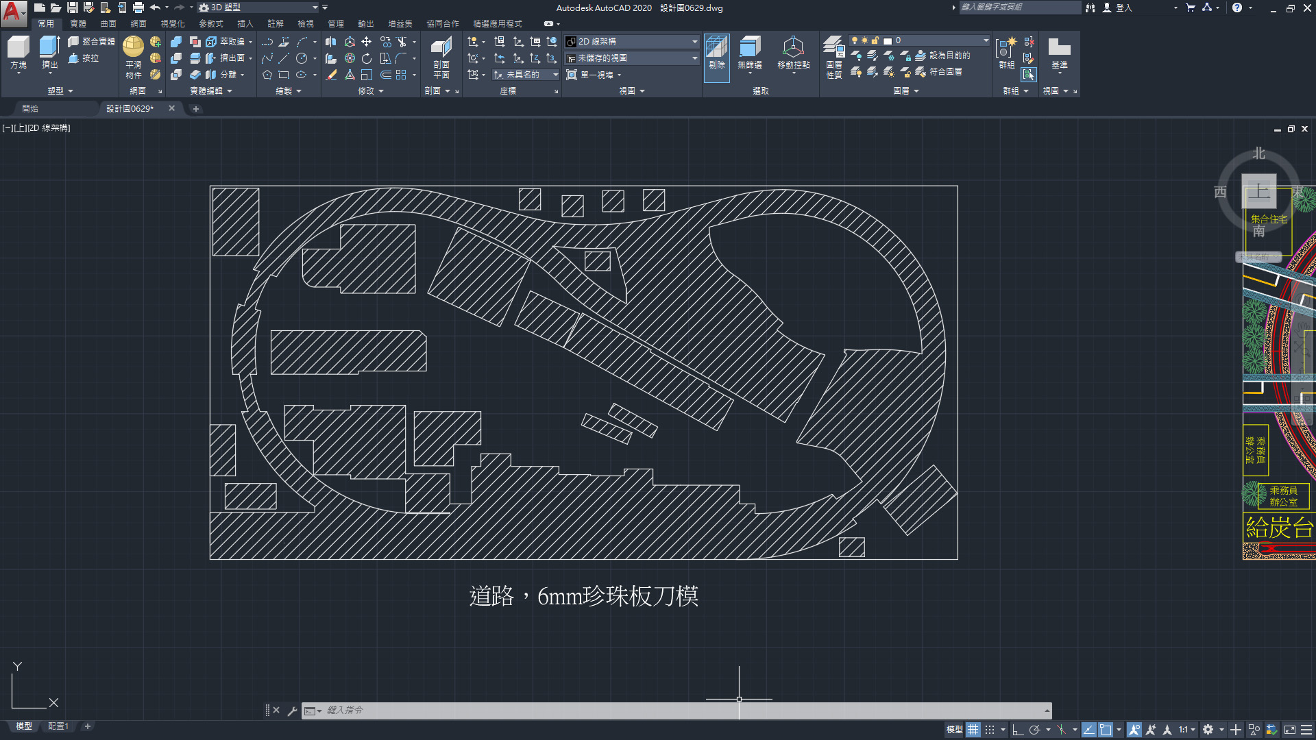 也就因為我打算做成平面式的,就需要先將軌道、建物、路型...等先割出來,所以一樣先用CAD畫好,在用大圖輸出的方式將線條輪廓印出來。因為TOMIX的軌道厚度為6mm,因此在這道路層的部分依然採用二塊3mm珍珠板合成1塊,順著線條輪廓切割。