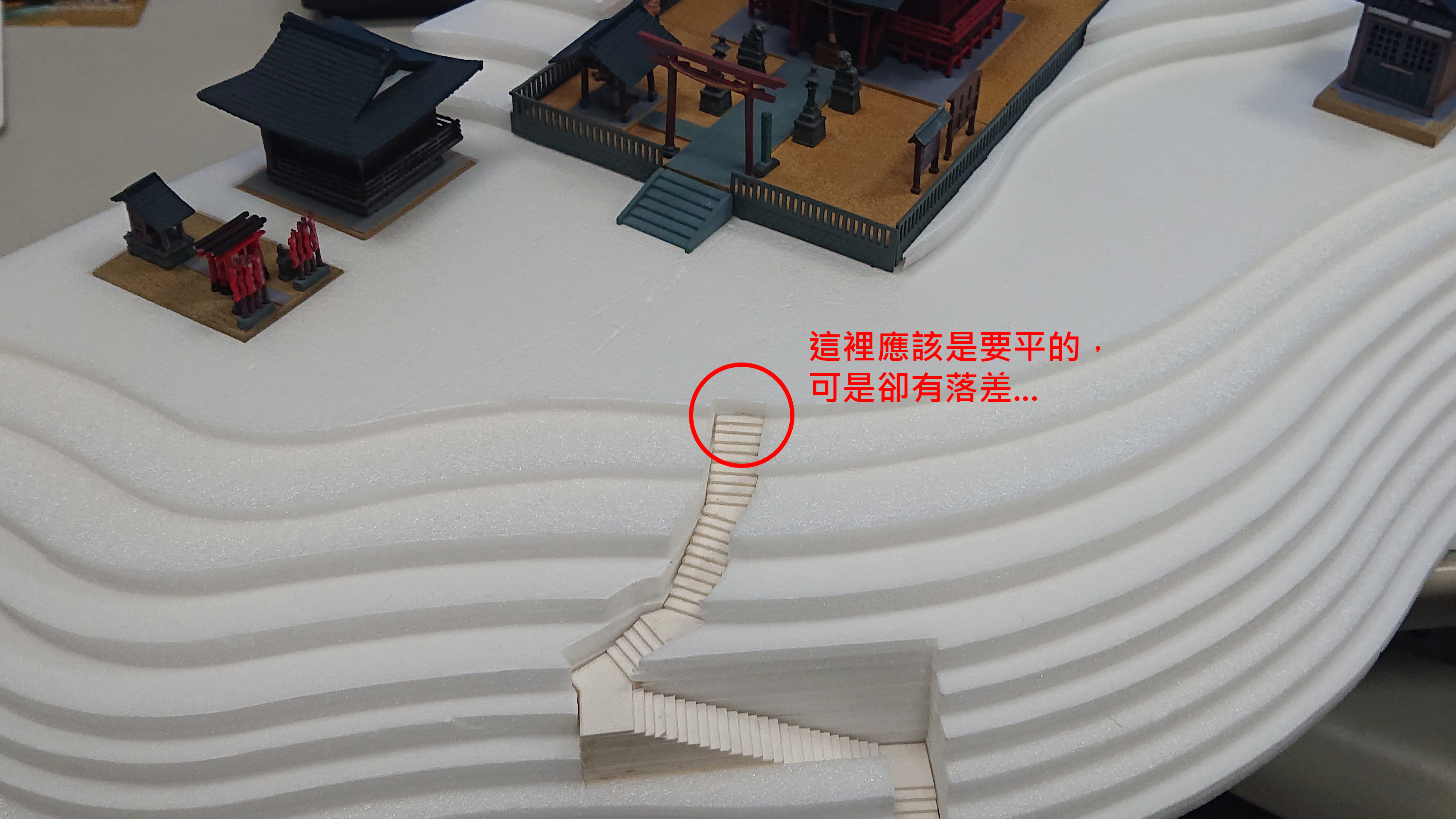 其實,再做好山坡後將樓梯安裝上去時,我就發現一個小問題,照CAD畫3D模擬時,應該40階的高度會跟山坡平台一樣高,可是現實上卻有落差,後來我想了想,應該是因為我是將二塊3mm的珍珠板合成一塊,在加上好幾層堆疊起來,中間黏固的白膠水厚度,影響了高差