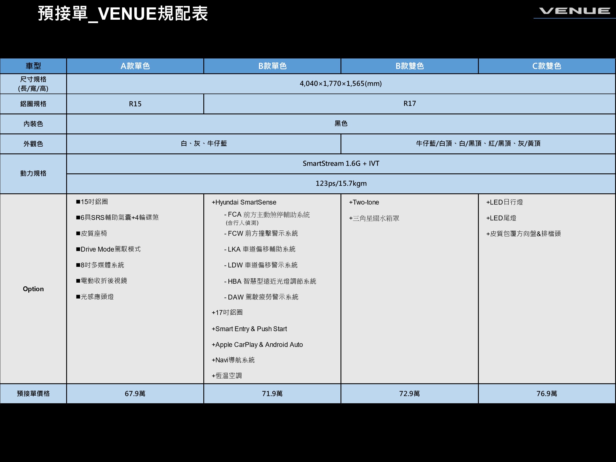 Hyundai Venue預購規格與配備表(點擊小圖可放大)